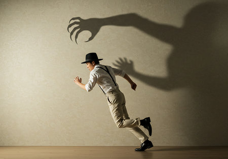 A man in a light beige suit and black hat is running away from a large, menacing shadow hand cast on a beige wall. Generative Ai