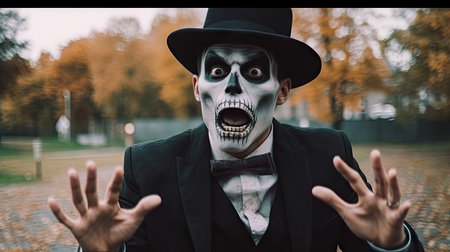 a man in a suit and top hat with his hands out, while he is wearing a skeleton face mask
