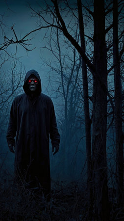 A menacing figure in a black cloak with glowing red eyes stands in a dark forest, perfect for horror and fantasy themes.