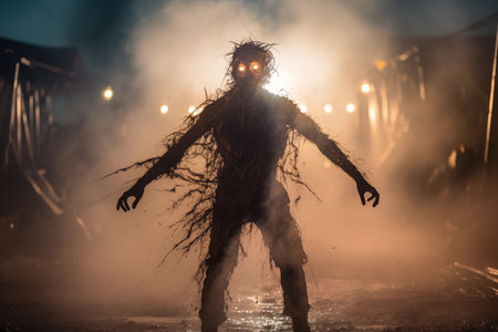 Epic zombie standing in the rain with muddy clothing and emerging from the mist, surrounded by sparks. Creepy unrecognizable revived human on road. Generative AI