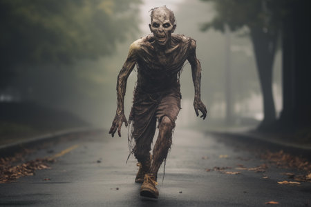 Zombie staggering forward with prosthetic wounds and ripped clothing, enveloped in fog. Creepy contagious human on road. Generative AI