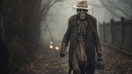 the withered old man, adorned in tattered rags, stands eerily on a rural path, his mouse-like head a testament to the supernatural curses that haunt the desolate landscape, as a skeletal figure lurks in the shadows, evoking a sense of foreboding and terror, perfect for fans of dark fantasy and horror art. ai generated