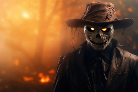 Horror devil costume with spooky pumpkin skull in black dressed for halloween carnival. Devil cosplay in ghost mask and raise hand with blank copy space for your advertising content.