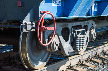 wheels of a railway carriage standing on the railway tracks