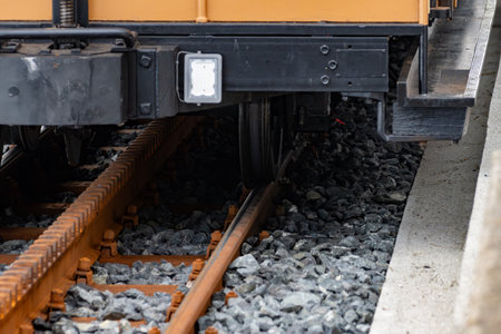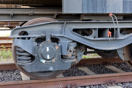 Close view of train wheels and suspension