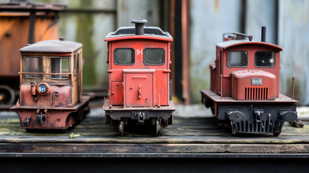 Three weathered miniature train models are showcased on a wooden surface in a workshop. They exhibit intricate details and vibrant red paint.