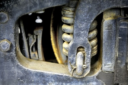Train wheel close-up with large spring.