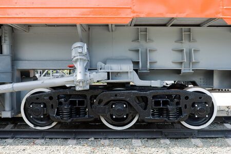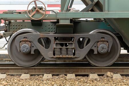 Railway wheels narrow gauge railway and ordinary railway. Freight cargo train or boxcar chassis, suspension and metal wheels stand on the rails, close-up