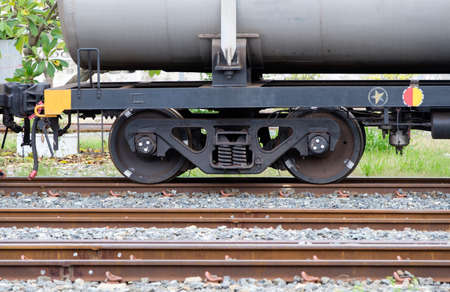 The bogie of the oil tanker in the freight train is parking in the railway yard of the city station, waiting to contain the oil in the oil depot, front view with the copy space.