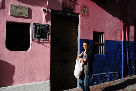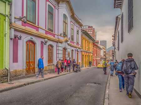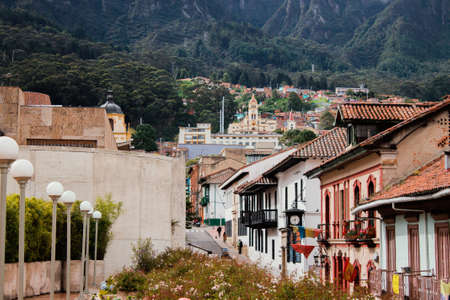 Bogota, Colombia - September 13, 2013: Street of Bogota with colonial colorful houses, La Candelaria district.