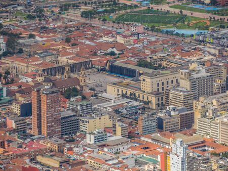 Aerial view from a skyscraper of the Candelaria historic downtown district, Bogota colombia