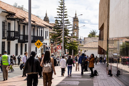 Streets of La Candelaria neighborhood, with buildings from the colonial era, important tourist site of the city, Bogotá Colombia July 6, 2022