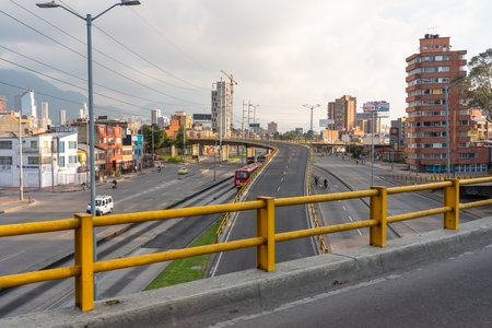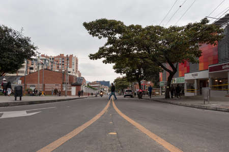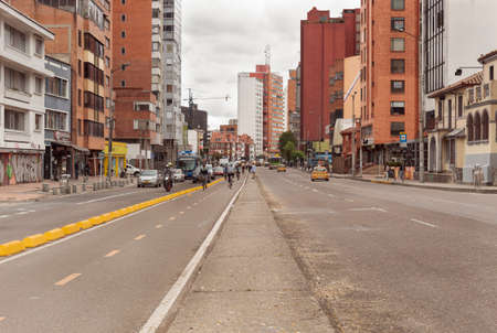 BOGOTA, COLOMBIA - A wide open shot of 7th avenue at Chapinero neighborhood. One of the most bogota avenue at normal day midday with cicloruta bikepath