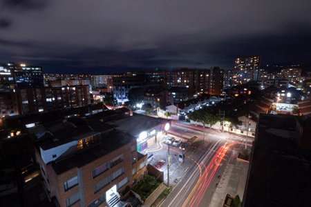 Beautiful night long exposure shot of popular neighborhood at Bogota north city known as cedritos with traffic lights and apartment buildings