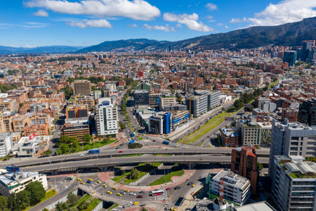 Aerial view of Bogota, Colombia, showcasing the city's skyline with tall buildings, sprawling urban landscape, and surrounding green mountains under a blue sky with scattered clouds.