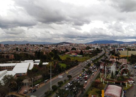 Aerial view of downtown Bogota at the 19 avenue roundabout with public transport traffic. Bogota Colombia. January 29, 2020