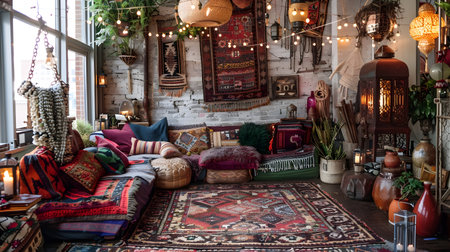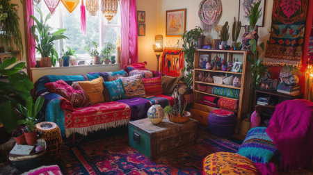 Bohemian living space with colorful textiles, hanging plants, patterned rugs, and eclectic furniture set in warm lighting