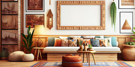Living room decor, home interior design . Bohemian Eclectic style with Gallery Wall decorated with Rattan and Textiles material . Generative AI AIG26.