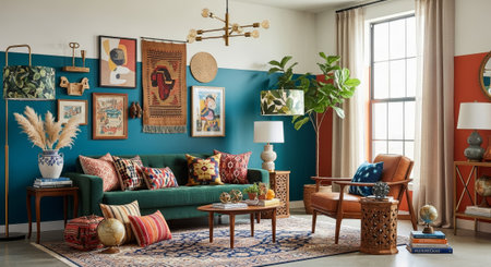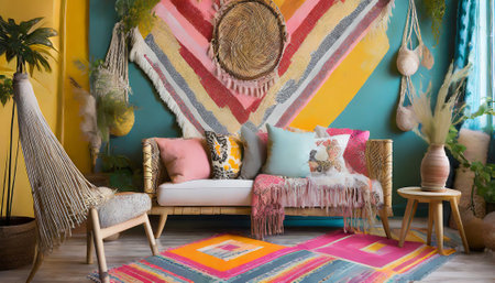 Modern bohemian living room interior. Colorful rugs and cushions, rattan furniture, and a mix of vibrant patterns. White walls adorned with macrame hangings and shelves filled with eclectic decor items. Large indoor plants add a touch of greenery.
