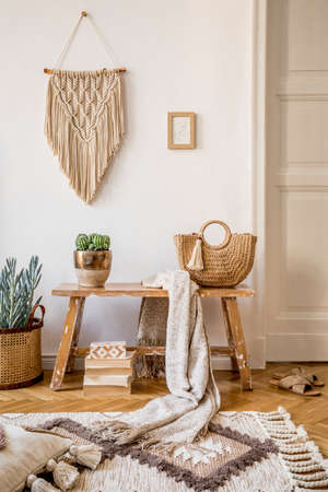 Stylish composition of living room interior with mock up frame, wooden bench, pillow, plaid, woman bag, books, cacti, macrame, plant, decortaion and elegant personal accessories in modern home decor.