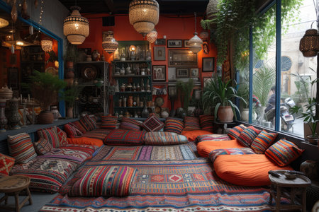 Cozy bohemian cafe interior with colorful decor and plants during daylight