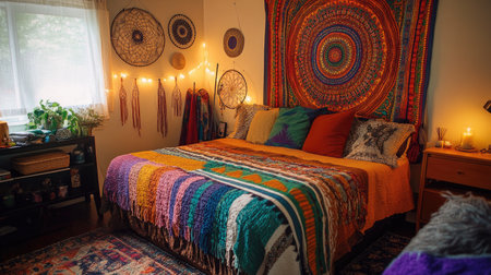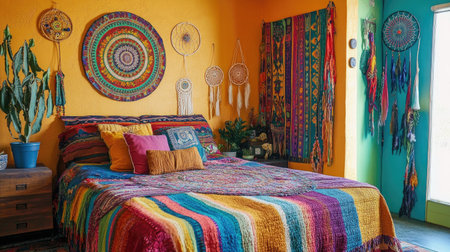 This vibrant bedroom captures a cozy and inviting atmosphere with bright colors and unique decor. The bohemian style is showcased through intricate textiles and artistic wall hangings, creating a cheerful and comfortable space for relaxation and creativity.