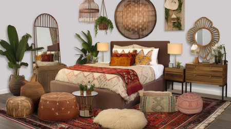 Bedroom decor, home interior design . Bohemian Eclectic style with Tapestry decorated with Rattan and Textile material . Generative AI AIG26.