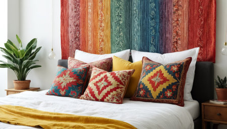 Vibrant bedroom with colorful patterned pillows and tapestry