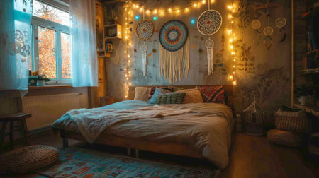 A beautifully styled bedroom featuring a cozy bed adorned with a colorful quilt, dreamcatchers on the wall, and warm lighting that creates an inviting atmosphere.