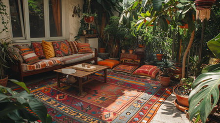 bohemian atmosphere with rugs, colorful cushions and potted plants around the sofa and table. generative ai