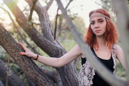 Pretty amazing free red-haired hippie girl outdoors, feathers and braids in her hair, white dress, vest with fringe, accessories.
