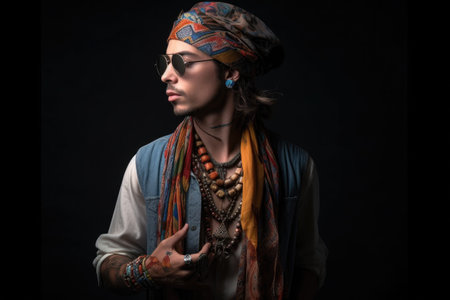 gender neutral, fashion and man with black background for bohemian style in trendy retro clothing, created with generative ai