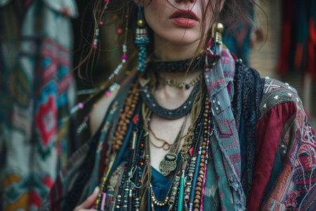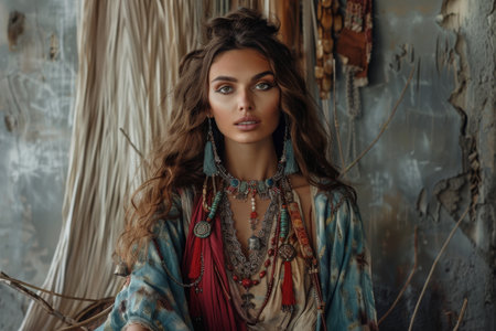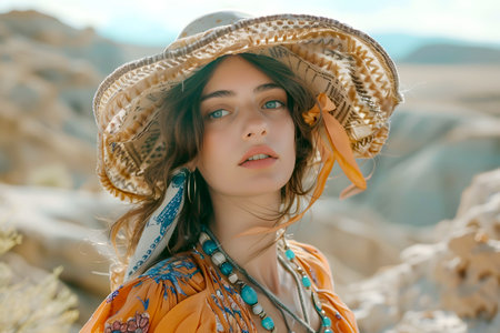 A lovely woman with a striking, colorful headdress, embodying grace and the vividness of her cultural expression, A bohemian lady model adorned in layered jewelry and flowing fabrics, Ai generated