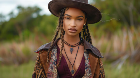 Confident Young Woman with Braids and Hat in Nature, Bohemian Style, Outdoor Portrait