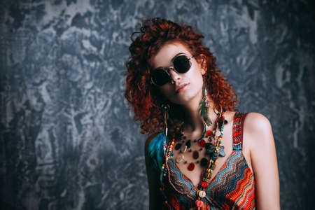 Close-up portrait of a beautiful bright woman with curly foxy hair in sunglasses, earrings and beads.