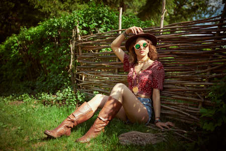 Adorable girl in hippie style clothes and accessories rests by a wicker fence in the countryside. Boho and hippie style. Vacation. Beauty and fashion.