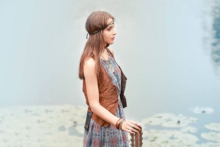 A beautiful romantic girl in boho style clothes and accessories stands in a field near the reeds and looks into the distance. Boho and hippie style. Summer, vacation.