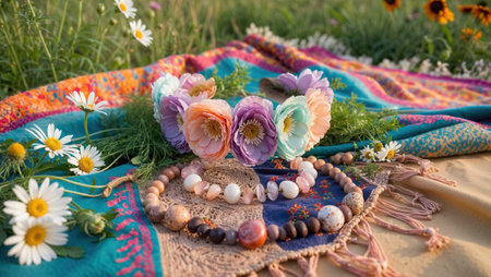 Bohemian Flower Crown and Beaded Jewelry on Colorful Tapestry.