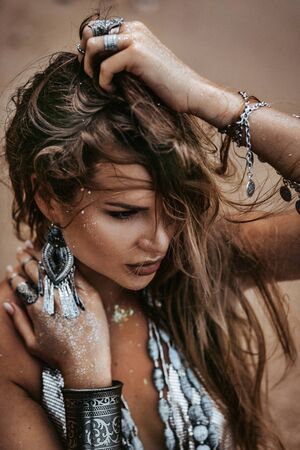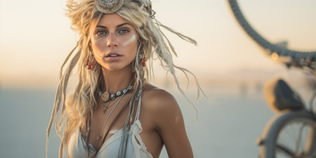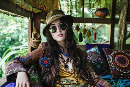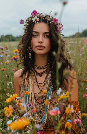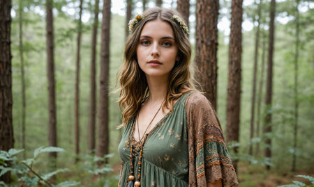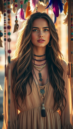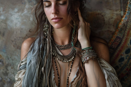 A bohemian lady model adorned in layered jewelry and flowing fabrics Ai generated