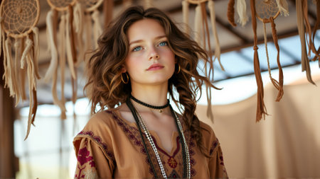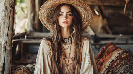 Young woman with long brown hair wearing bohemian style clothing, posing in a rustic setting. Ai generative