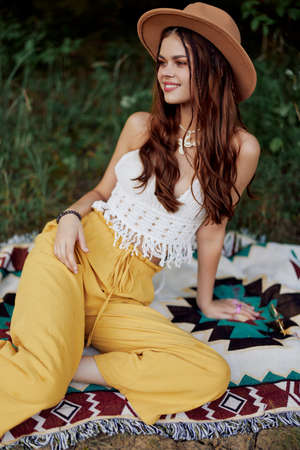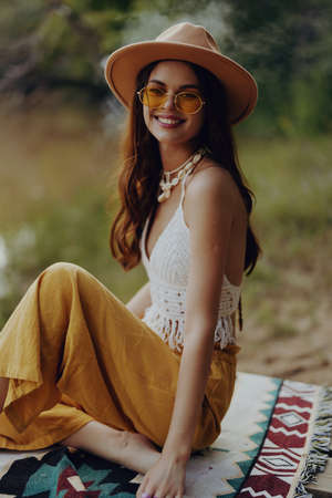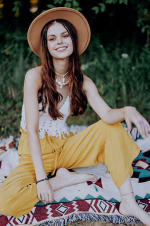 A beautiful young woman in a hippie look with yellow pants, knit top, hat, and yellow glasses sits on the ground on a plaid in the park and smiles happily looking at the camera