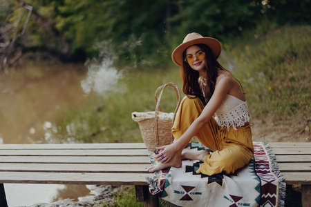 A hippie woman sits on a bridge by a lake on a nature trip and smiles happily in eco-clothing.