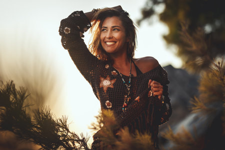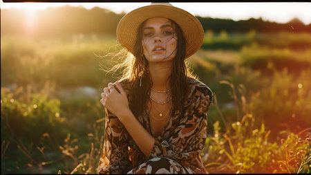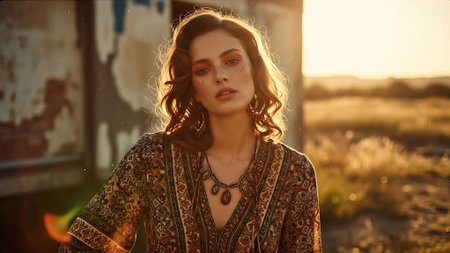 A confident woman stands in a glowing desert sunset, showcasing her bohemian outfit and accessories. The warm light highlights her beauty and serene expression.