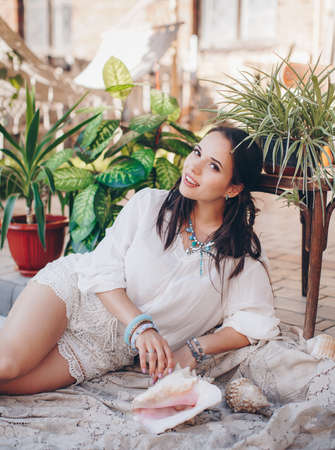 Portrait of a beautiful young hippie woman in ethnic clothes.