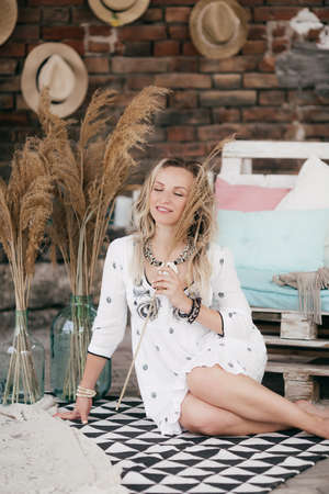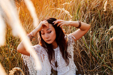 Beautiful hippie girl stands among the reeds in a summer sunny day. Spirit of freedom. Fashion shot. Bohemian, bo-ho style.