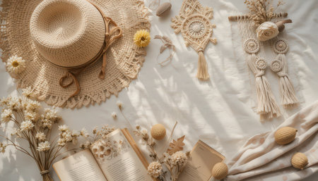 Creative arrangement features a woven hat, textured macrame, dried flowers, and an open book under soft sunlight.