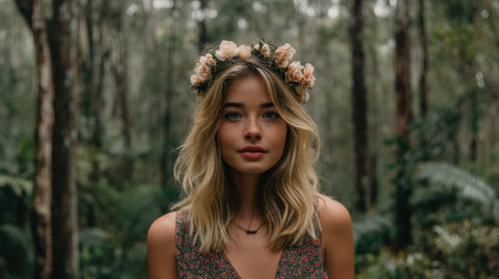 This captivating portrait features a serene woman adorned with a delicate flower crown amid a lush forest, embodying natural beauty and tranquility.
