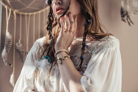 cropped view of girl with braids in white boho dress on beige with dream catcher