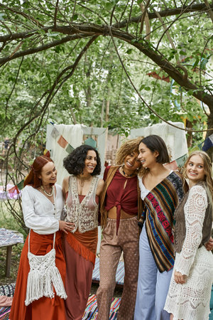 positive multiethnic women in boho clothes hugging while spending time in retreat center