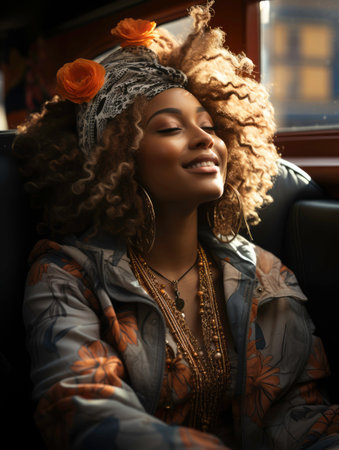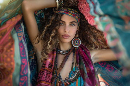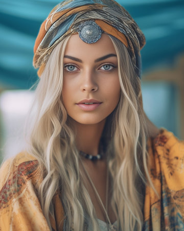 A lovely woman with a striking, colorful headdress, embodying grace and the vividness of her cultural expression, A bohemian lady model adorned in layered jewelry and flowing fabrics, Ai generated